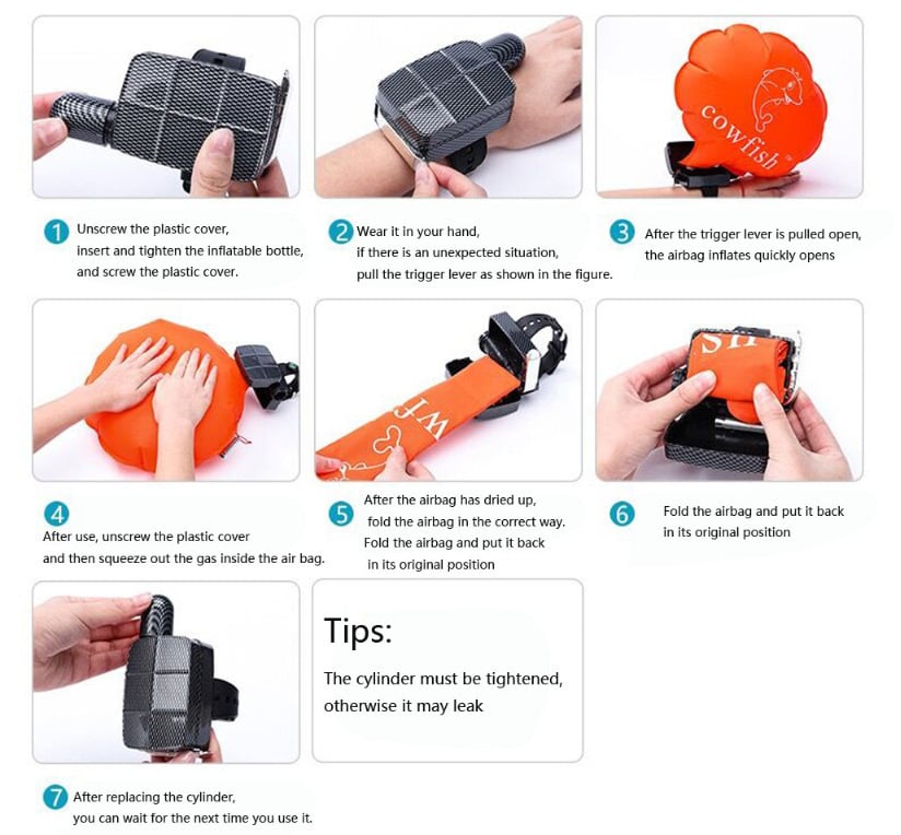 Life-Saving Hand Ring: to use it simply pull the lever on the wristband and the flotation device will inflate within seconds, thus floating you to the surface of the water.then use the product to bring the compass to identify the direction